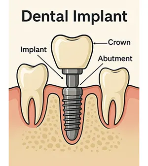 A dental implant is a durable, biocompatible post—typically made of titanium—used to replace the root of a missing tooth. It serves as a strong foundation for a custom-made crown, restoring both the look and function of a natural tooth.