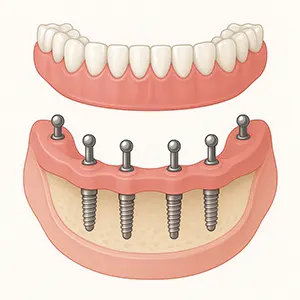 - Attachment of the Denture – Once the implants are fully healed, a custom-made denture is designed to fit onto the implants. The denture can snap on and off for easy cleaning.